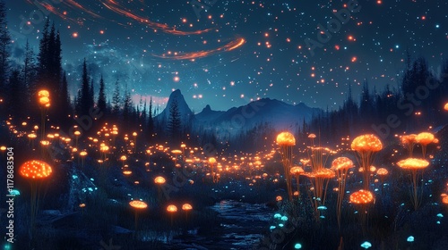A surreal alien nightscape with glowing plants and luminous trails in the sky