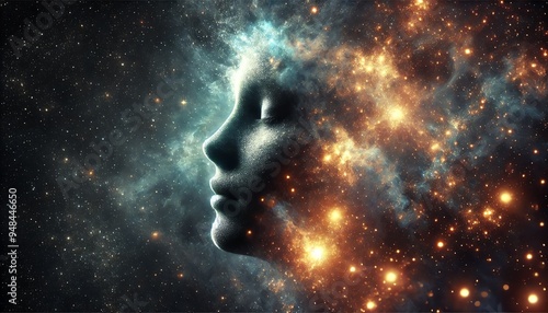 A surreal and ethereal image of a peaceful face in profile, floating in a cosmic space