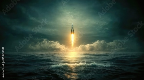 A surreal dreamscape featuring a floating rocket drifting through a celestial ocean