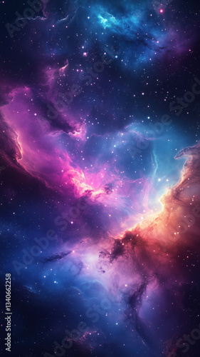 A surreal intergalactic landscape with swirling blue, purple, and pink hues forming a glowing cosmic tapestry.