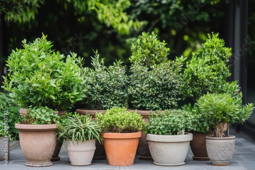 A symmetrical arrangement of multiple potted plants in varied planters, showcasing different greenery types.