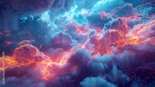 A Symphony of Data: Glowing Information Flows in Harmony Across a 3D Cloud Network, Generative AI
