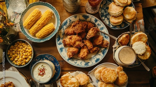 A table filled with fried chicken pieces, biscuits, and corn on the cob, creating a hearty Southern meal
