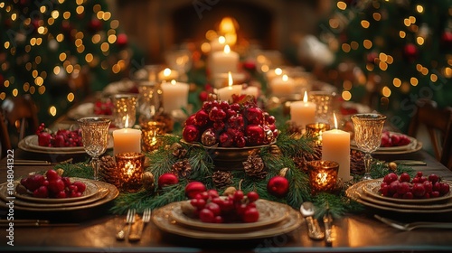 A table is set for a Christmas dinner with many candles and fruit. Generative AI
