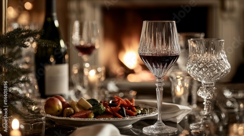 A table set for an elegant dinner with red wine, sparkling water, and a fruit platter.