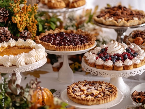 A Table Spread with an Assortment of Homemade Pies and Tarts