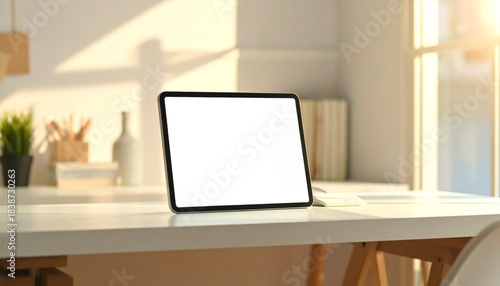 A tablet with blank screen placed on a neutral desk surface with soft warm daylight and clean modern workspace styling.