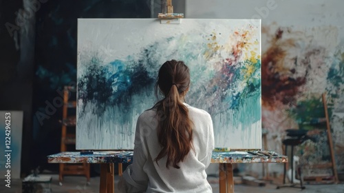 A talented Asian female artist creating her masterpiece in a cozy art studio.