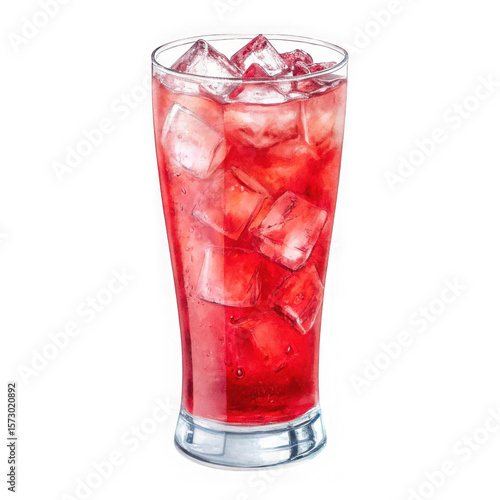 A tall glass filled with a refreshing red beverage and ice cubes isolated on transparent background