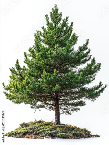 A tall pine tree with sharp needles and a slender trunk, isolated on white background