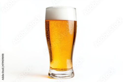 A tall, slender glass of golden beer with a frothy white head, set against a stark white background.
