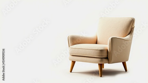 A tan chair with wooden legs sits on a white background. The chair is the main focus of the image, and it is a comfortable and inviting piece of furniture