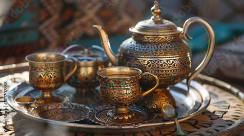 A tea adorned with detailed metal craftsmanship.