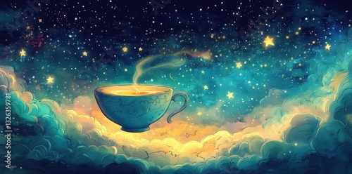 A teacup rests among the clouds under the starry night sky