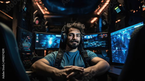a techie sitting relaxed in front of a computer, happy relaxed expression