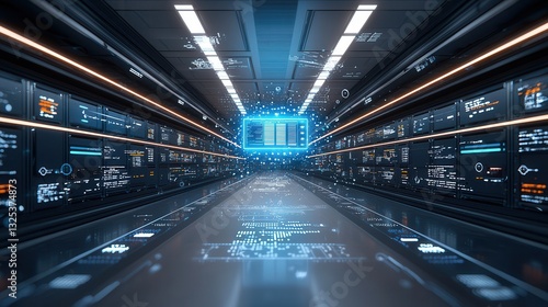 A technologically advanced automated warehouse with towering shelves and a sleek high tech interior designed for efficient inventory management and distribution