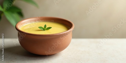 A terracotta bowl filled with creamy golden soup garnished with a fresh green leaf, set against a muted background.