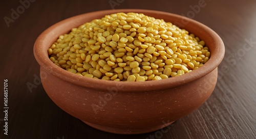 A terracotta bowl overflowing with vibrant yellow split peas.