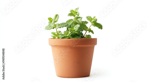 A terracotta pot containing a healthy green mint plant, isolated on a white background, illustrating home gardening or indoor plant concept.