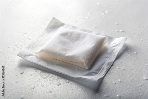 A tightly cropped composition of a single make-up remover wet wipe, glistening with moisture, and illuminated by a soft