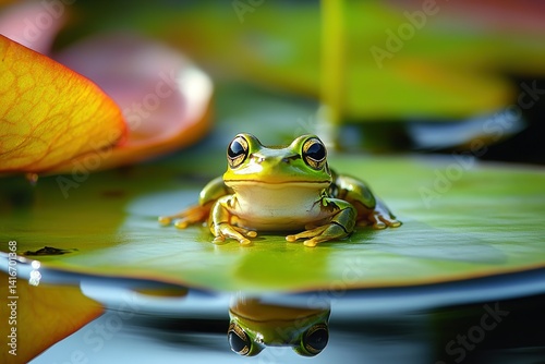 A tiny frog sitting on a lily pad, with its legs tucked under and its eyes wide open
