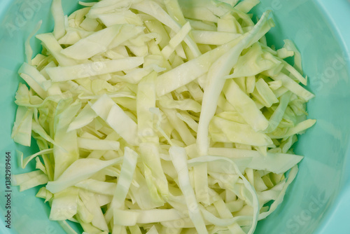 A top-down, close-up shot of shredded white cabbage in a light green bowl, highlighting its fresh texture and pale color