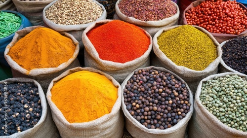 A top-down view of a spice market stall, showcasing an array of spices in vibrant colors, arranged in large sacks and bowls