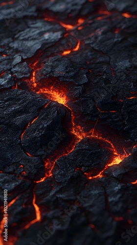 A top-down view of the dark, jagged surface of an erupting volcano with lava flowing down it