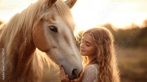 A touching moment between a girl and a horse under a golden sunset, encapsulating the bond of friendship, love for animals, and tranquility of nature.