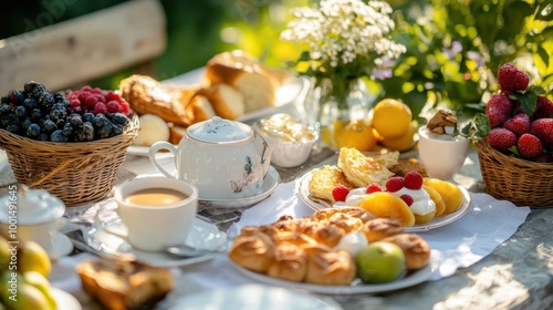 A traditional breakfast spread with pastries, coffee, and fruit arranged on a sunny garden table, creating a peaceful scene.