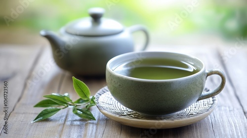 A traditional cup of green tea served in a small ceramic teapot, representing the calming and healthful properties of tea