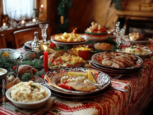 A traditional Polish Christmas Eve dinner (Wigilia), with 12 dishes served and an extra seat left at the table for an unexpected guest.