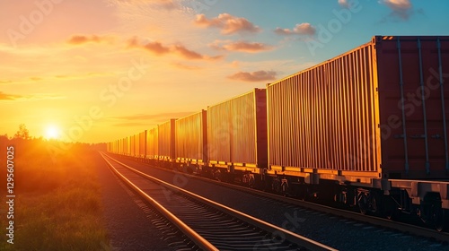 A Train Loaded with Freight Containers Moving Along a Railway Track at Sunset : Generative AI
