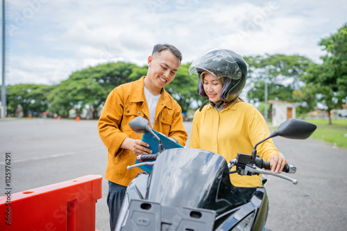 a trainer is showing a board to a motorcyclist