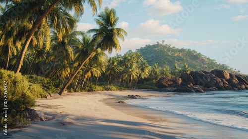 A tranquil beach scene with swaying palm trees, white sand, and clear blue waters. The lush green foliage creates a sense of serenity, inviting you to escape and relax.