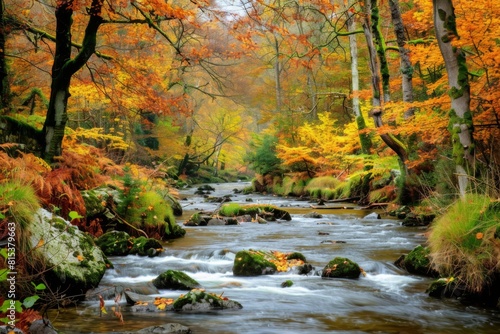 A tranquil forest glen with a babbling brook and vibrant autumn foliage