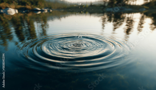 A tranquil lake scene shows ripples spreading across the water's surface, reflecting the surrounding trees and creating a sense of serenity and natural beauty in the peaceful environment.