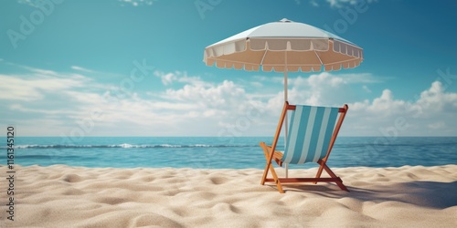 A tranquil scene of a beach vacation, featuring an inviting blue chair under a white umbrella against the backdrop of a clear sky and blue sea.