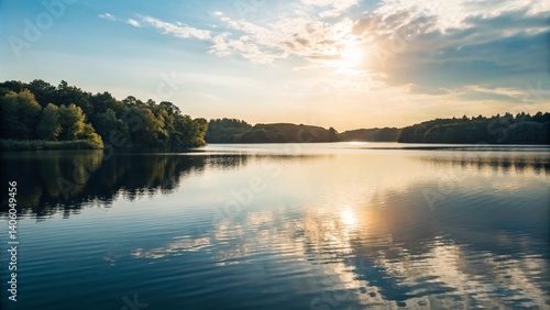 A tranquil scene of a calm lake reflecting the soft hues of the sunrise or sunset sky, with a dark green forest lining the distant shore. The water is still, creating a mirror image of the sky and tre
