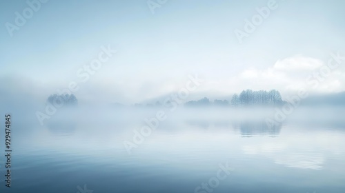 A tranquil scene of a vast, fog-covered lake with barely visible treetops emerging through the cloudiness