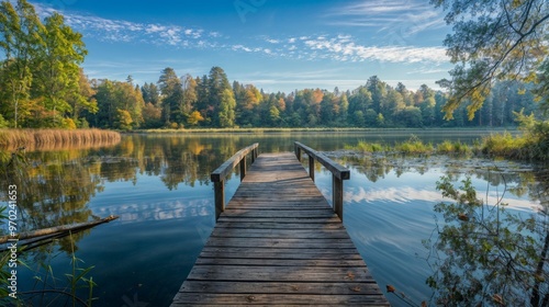 A tranquil scene of a wooden dock extending over a calm lake, surrounded by trees and reflecting a peaceful sky..