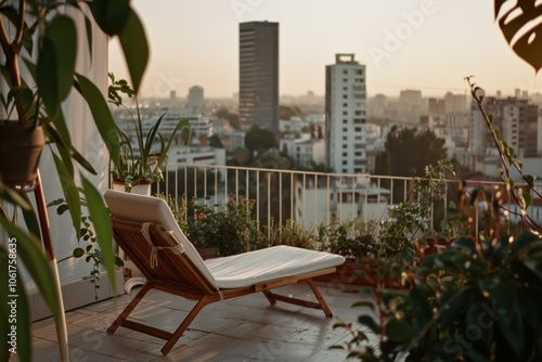 A tranquil urban balcony oasis at sunrise, adorned with lush plants and modern furniture, overlooking a vibrant cityscape.