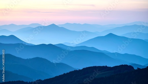 A tranquil vista of layered mountain ranges at dawn or dusk, bathed in soft pastel colors. Silhouetted peaks and valleys are depicted in varying shades of blue