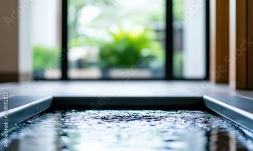 A tranquil water feature enhances the modern interior, reflecting the natural light from the window.