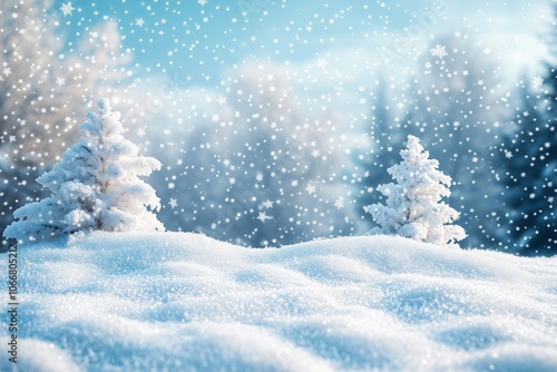 A tranquil winter landscape with snow-covered trees and gentle snowfall under a blue sky