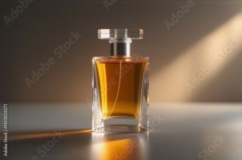 A translucent amber perfume bottle sits on a reflective surface, bathed in warm, golden sunlight. The elegant, rectangular bottle casts a subtle shadow, highlighting its clear glass and rich liquid c