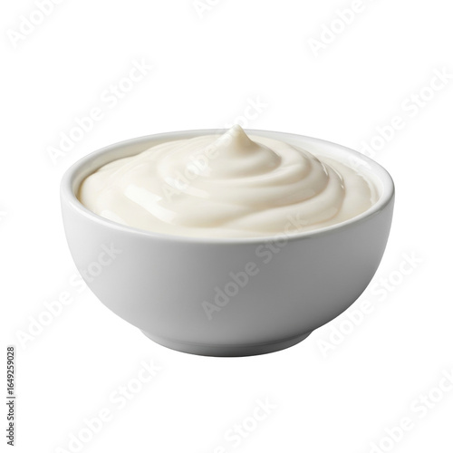 A transparent ceramic bowl generously filled with creamy, viscous garlic aioli, showing soft peaks, isolated on a seamless transparent background. Concept for food product advertising