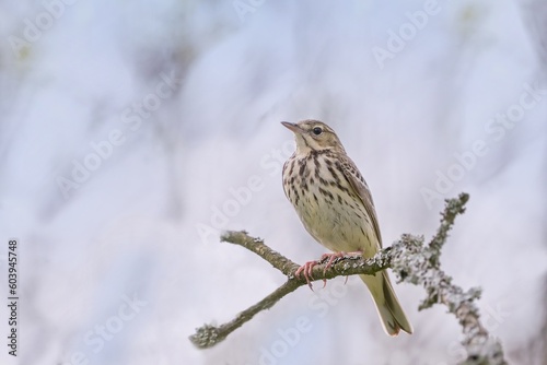 A Tree pipit sitting on the branch. Anthus trivialis.