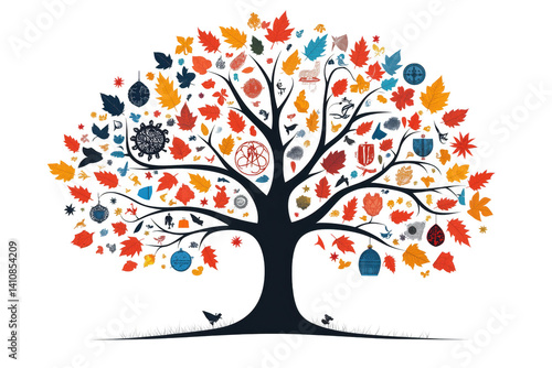 A tree with leaves representing different religions, symbolizing growth and diversity isolated on a transparent background