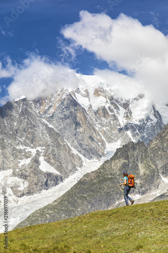 A trekker is walking in front of the Mont Blanc during the Mont Blanc hiking tours (Ferret Valley, Courmayeur, Aosta province, Aosta Valley, Italy, Europe).